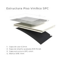 Los pisos SPC (Stone Plastic Composite), también conocidos como pisos rígidos de vinilo, son la más reciente actualización de los pisos vinílicos de lujo. Como lo indica su nombre, estos pisos tienen un compuesto de piedra plástica, lo que los hace más duraderos y resistentes que los pisos vinílicos tradicionales.